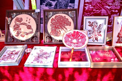 在青海省大通县边麻沟花海景区拍摄的手工艺人制作的剪纸作品。新华社发
