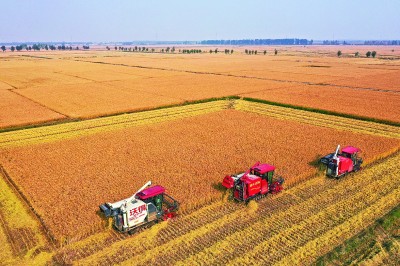 在吉林省公主岭市,收割机在收割水稻。新华社发